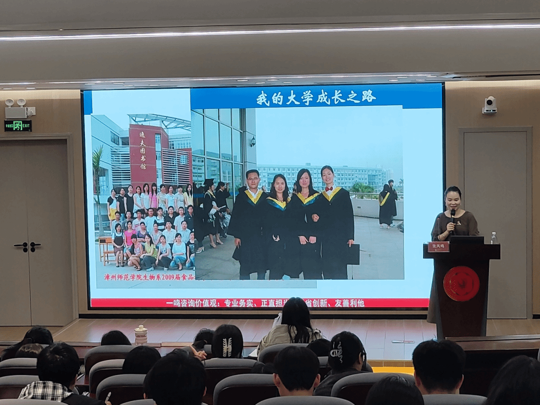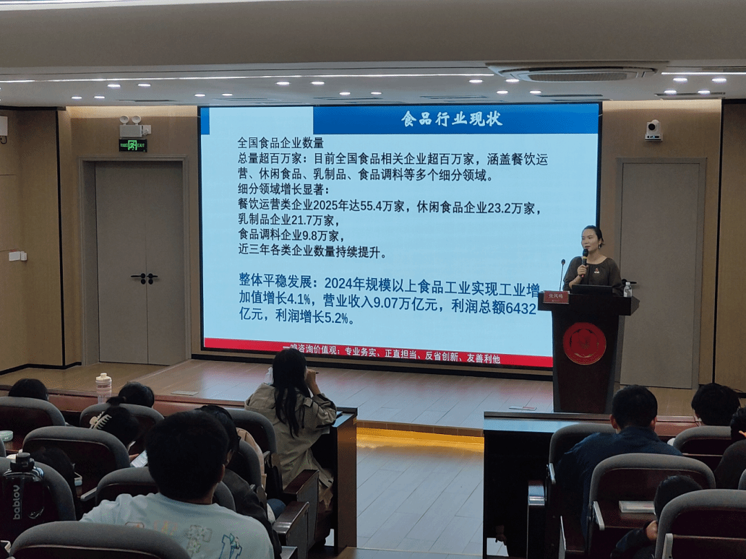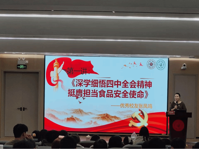 张凤鸣首先解读了党的二十届四中全会精神中关于食品安全的重要论述,结合市场监管总局通报的违规案例,直观呈现了当前食品行业的质量安全痛点与监管力度。在大学成长分享中,她讲述了自己从曾经陷入精神内耗的迷茫学子,通过勤工俭学和兼职来锤炼意志、在志愿服务中收获成长的蜕变历程,鼓励学弟学妹们培养吃苦、乐观、沟通等核心能力。