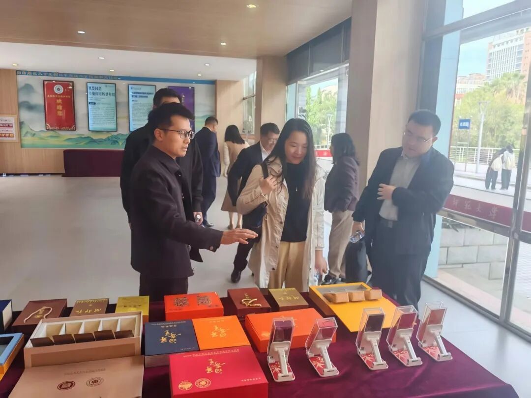 调研组一行在学院团委书记廖小文的陪同介绍下,深度了解了学院党建与业务深度融合之“闽师红”系列大学生科创精品,对学院党委立足闽南文化底蕴与漳州地方特色,创新开发的一系列特色产品表示赞扬,并鼓励学院进一步聚焦闽南文化创造性转化、创新性发展,助力漳州特色产业升级。