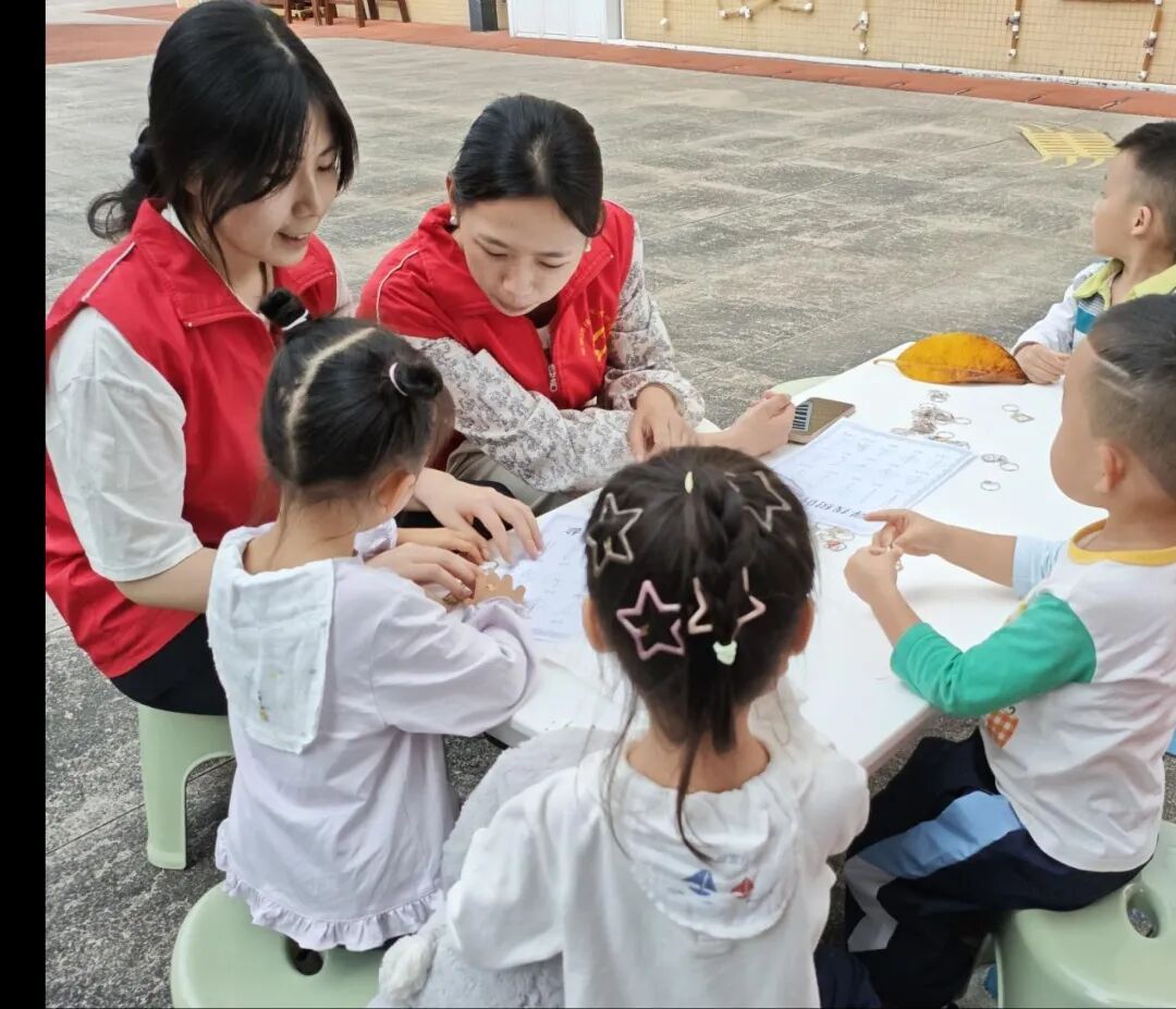 在“森林茶话会”环节,志愿者将孩子们分组围坐,分享手工创作的发现与趣事。志愿者还引导孩子们用树叶联想动物、物品等,在轻松氛围中加深观察与表达能力。